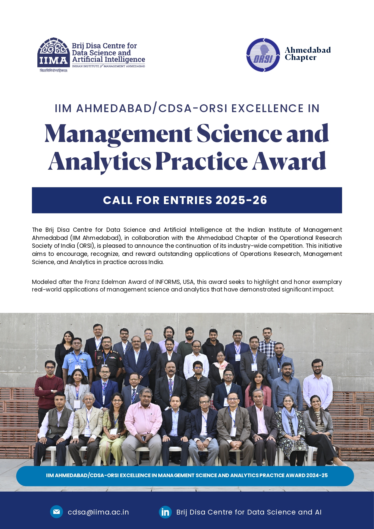 The Indian Institute of Management Ahmedabad (IIMA), in collaboration with the Operational Research Society of India (ORSI), successfully hosted the Ahmedabad chapter of the IIMA/CDSA-ORSI Excellence in Management Science and Analytics Practice Award on 12th January 2025. The event featured the top 5 finalists—SBI, John Deere, Armed Forces of India, JSW Group, and Tata Steel—showcasing innovative projects that demonstrated tangible outcomes such as cost savings, revenue growth, and business innovation. With insightful presentations and valuable inputs from an esteemed jury, the competition highlighted the transformative power of management science and analytics in addressing real-world challenges.