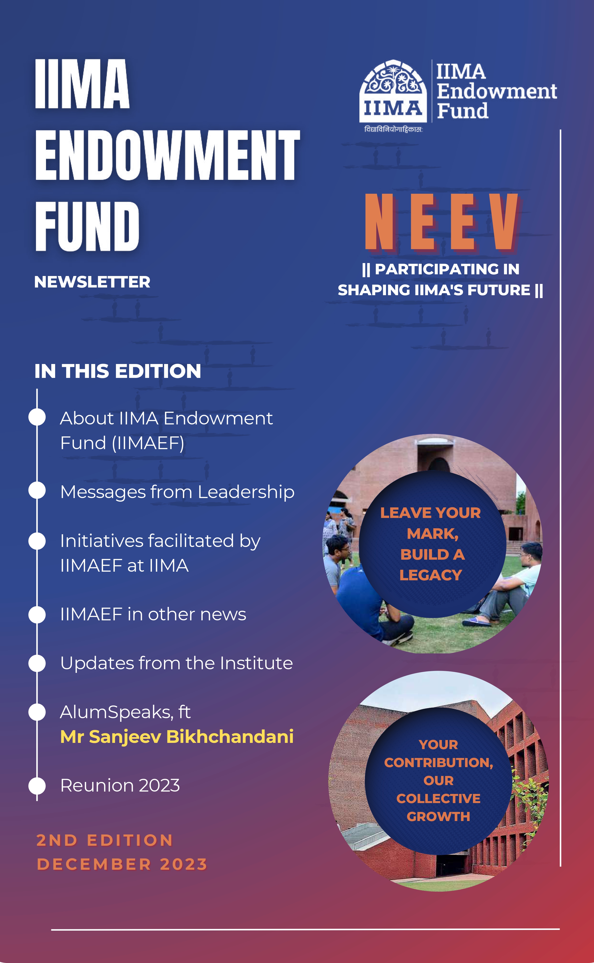 We are delighted to share the inaugural edition of IIMA Endowment Fund's newsletter - Neev, as a periodic update on our activities and Institute news. The inaugural edition covers the genesis of the IIMA Endowment Fund and our journey over the past two years. We thank the Institute, Board of Governors, IIMA faculty, staff, and community for their consistent support; and we are delighted to be a participant in shaping IIMA’s future with them, our alumni and our donors.