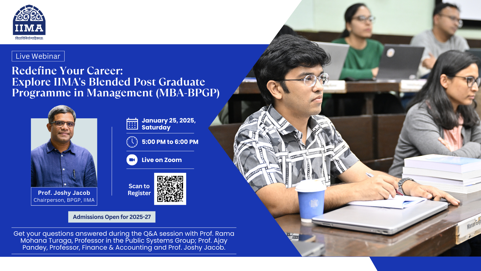 On January 25, 2025, IIM Ahmedabad hosted a webinar introducing the Blended Post Graduate Programme in Management (MBA-BPGP), a two-year degree designed for working professionals and entrepreneurs. The session featured insights by Prof. Joshy Jacob, Chairperson, BPGP; Prof. Rama Mohana Turaga, Professor, Public Systems Group, and Prof. Ajay Pandey, Professor, Finance & Accounting. The talk was followed by an engaging live Q&A. Attendees gained valuable insights into the program structure, benefits, and application process.