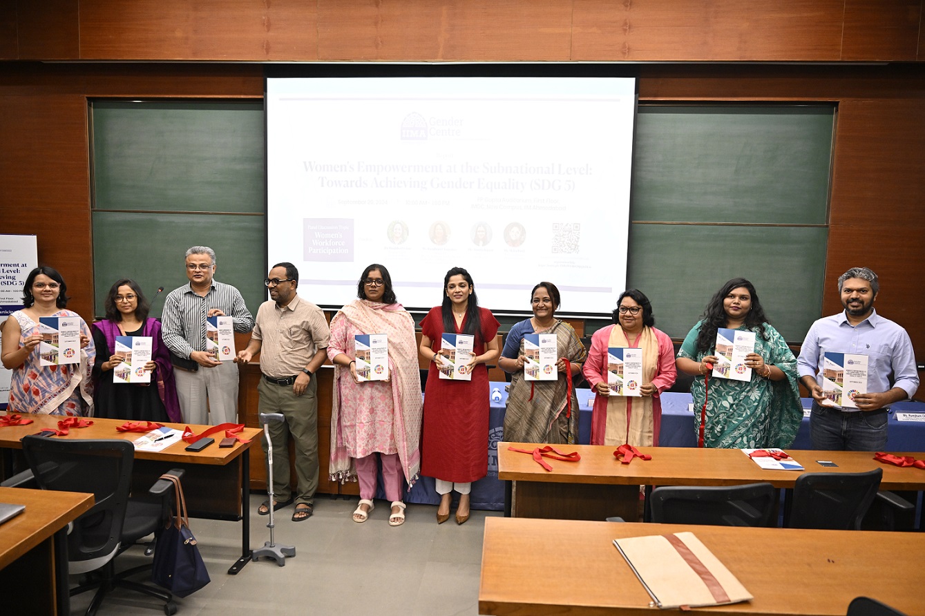 September 20, 2024: The Gender Centre at the Indian Institute of Management Ahmedabad (IIMA) launched a report today on the status of women’s empowerment in India as per the parameters stipulated in the Sustainable Development Goal 5 (SDG 5) on gender equality, focusing on subnational (district) level variations. The report was released by Professor Satish Deodhar, Dean (Faculty), and Professor Vidya Vemireddy, Chairperson Gender Centre and co- author of the report.