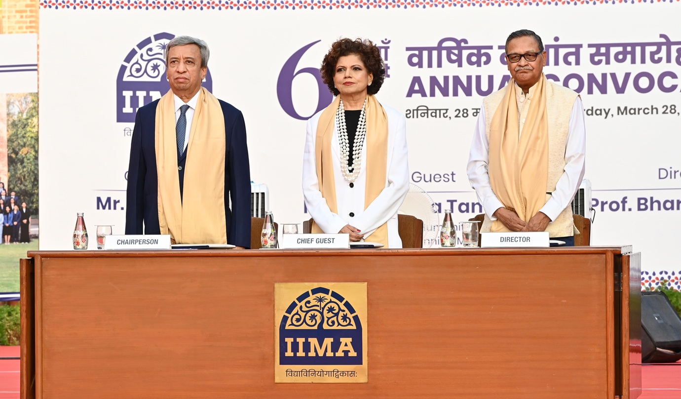 March 28, 2026: A total of 629 students were awarded their degrees at the 61st Annual Convocation ceremony of the Indian Institute of Management Ahmedabad (IIMA) held today at the iconic Louis Kahn Plaza on the campus. Ms. Chandrika Tandon, Business Leader, Humanitarian, Grammy-Award Winning Musician, and alumna of IIMA’s PGP Class of 1975, graced the occasion as the Chief Guest.