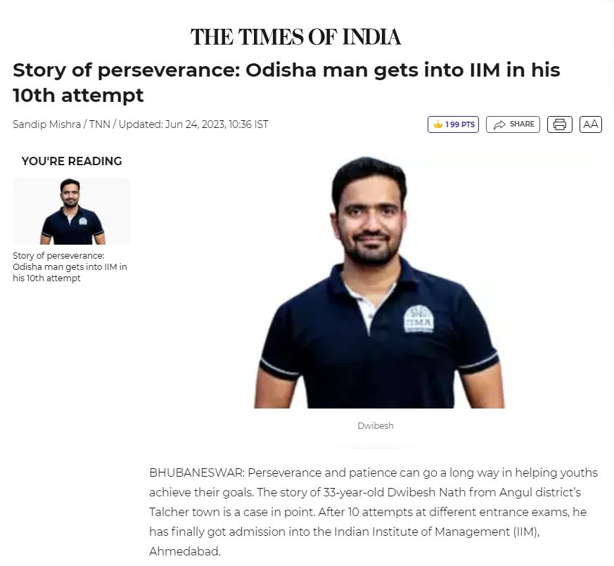 BHUBANESWAR: Perseverance and patience can go a long way in helping youths achieve their goals. The story of 33-year-old Dwibesh Nath from Angul district’s Talcher town is a case in point. After 10 attempts at different entrance exams, he has finally got admission into the Indian Institute of Management (IIM), Ahmedabad.