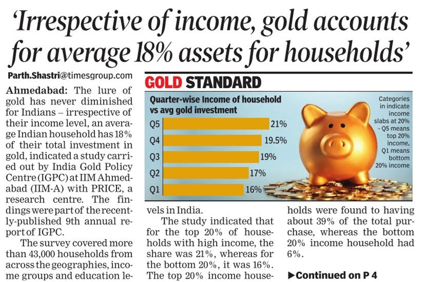 AHMEDABAD: The lure of gold has never diminished for Indians - irrespective of their income level, an average Indian household has 18% of their total investment in gold, indicated a study carried out by India Gold Policy Centre (IGPC) at IIM Ahmedabad (IIM-A) with PRICE, a research centre. The findings were part of the recently-published 9th annual report of IGPC.