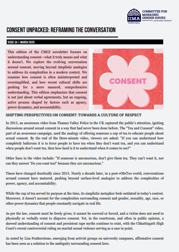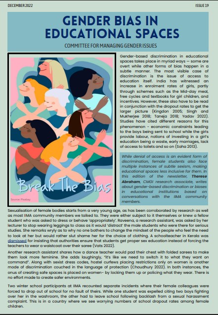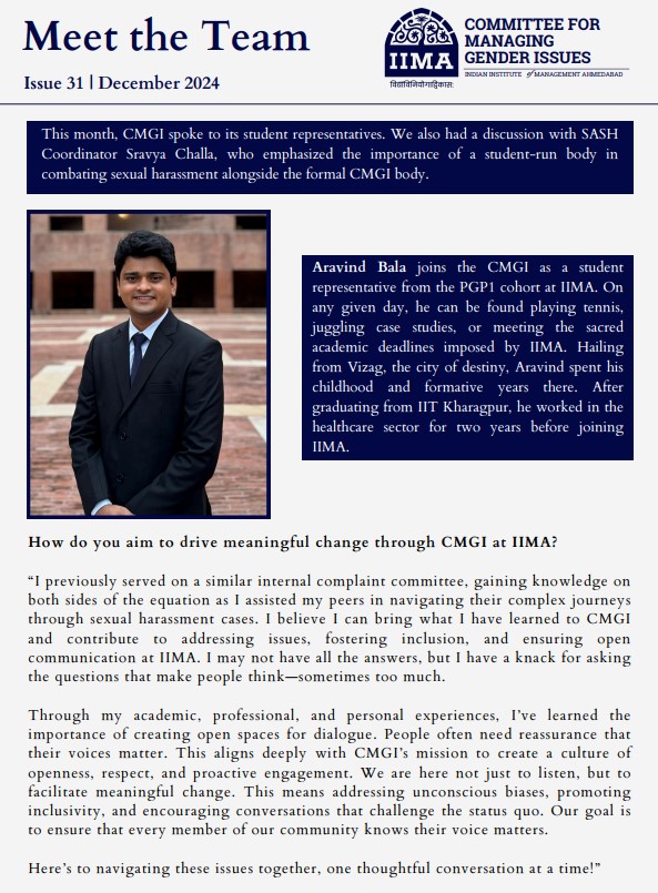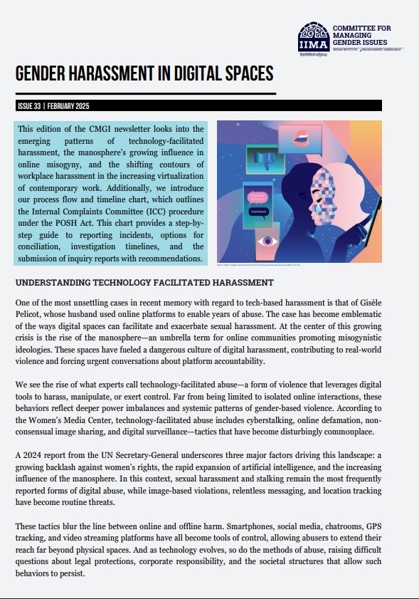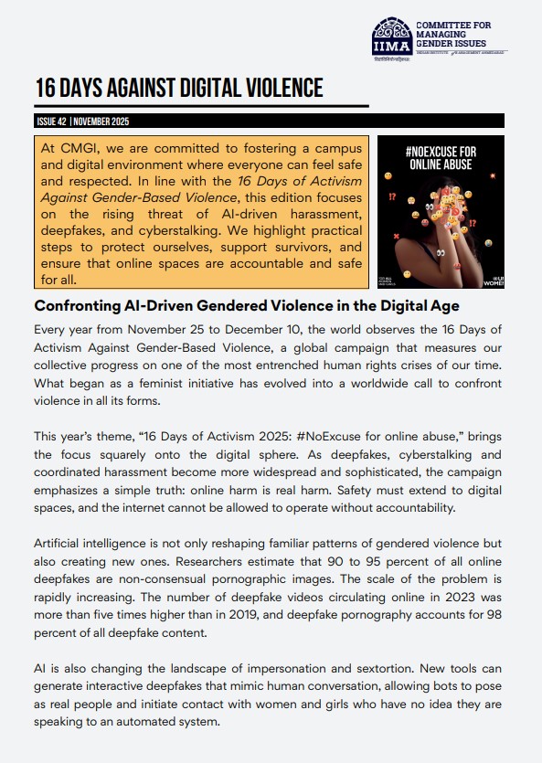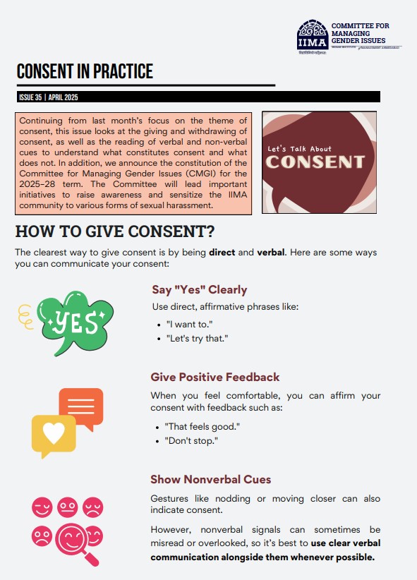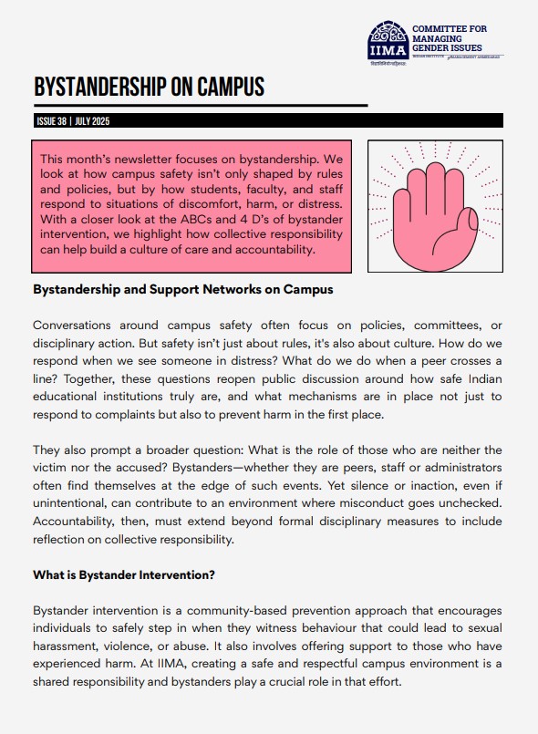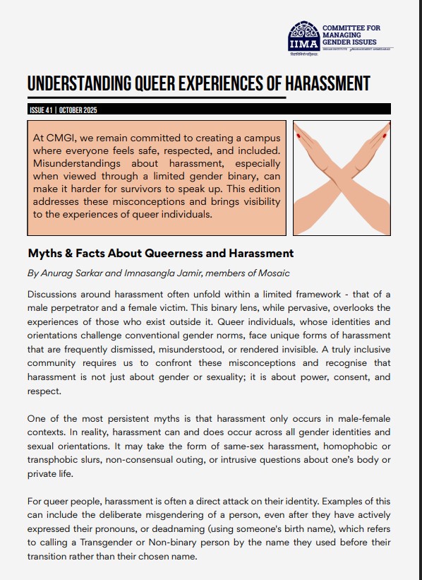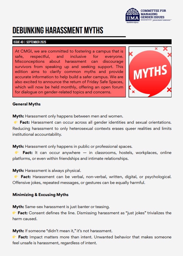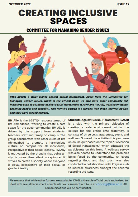 The Indian Institute of Management Ahmedabad (“IIMA”) has set up an Internal Committee known as the Committee for Managing Gender Issues (“CMGI”) in accordance with the Sexual Harassment of Women at Workplace (Prevention, Prohibition and Redressal) Act and Rules, 2013 and regulations applicable to higher educational and technical institutions. The objective of CMGI goes beyond what is mandated by the Act and rules: CMGI is not only confined to dealing with complaints of Sexual Harassment faced by women but also members of other genders. CMGI is committed to creating awareness and sensitization within the community regarding various forms of Sexual Harassment.