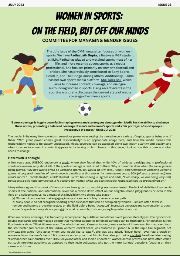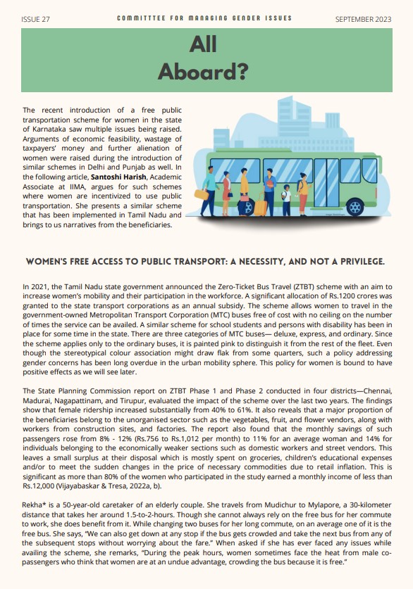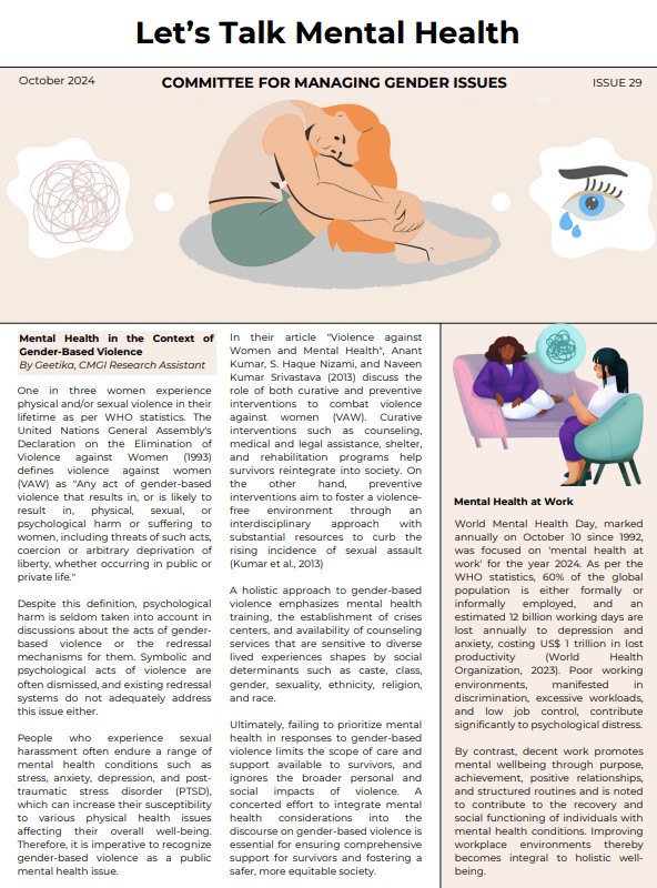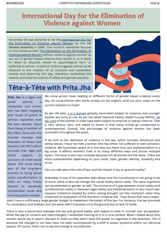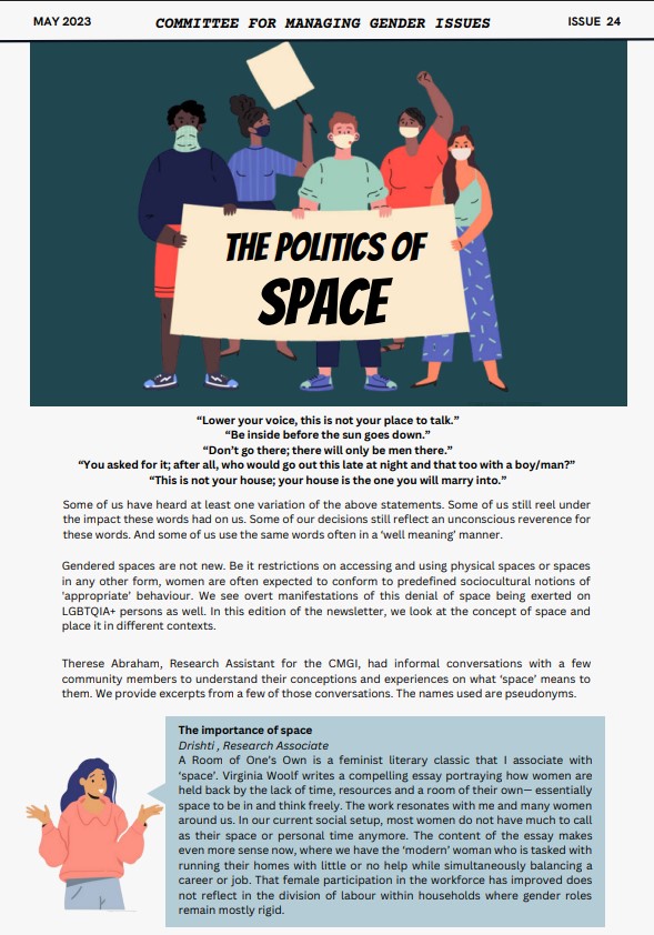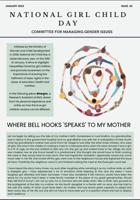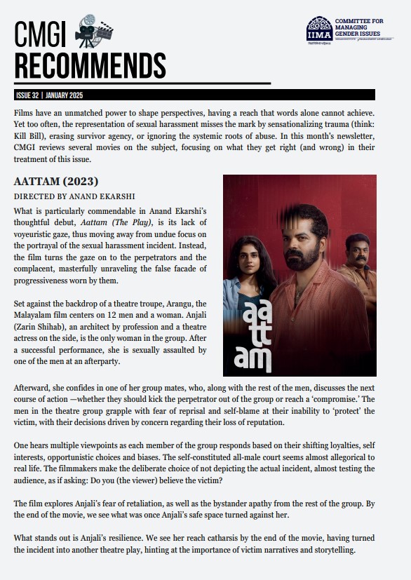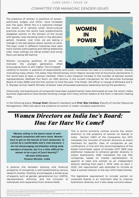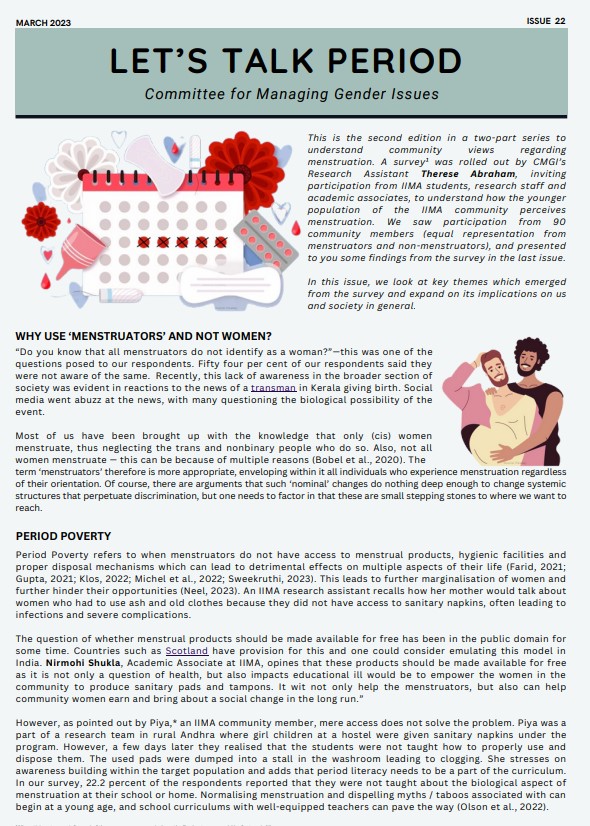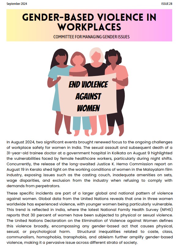 The Indian Institute of Management Ahmedabad (“IIMA”) has set up an Internal Committee known as the Committee for Managing Gender Issues (“CMGI”) in accordance with the Sexual Harassment of Women at Workplace (Prevention, Prohibition and Redressal) Act and Rules, 2013 and regulations applicable to higher educational and technical institutions. The objective of CMGI goes beyond what is mandated by the Act and rules: CMGI is not only confined to dealing with complaints of Sexual Harassment faced by women but also members of other genders. CMGI is committed to creating awareness and sensitization within the community regarding various forms of Sexual Harassment.